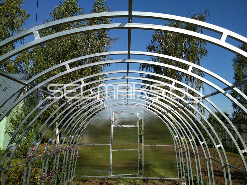 Немаловажным аспектом при выборе теплицы является расстояние между дугами. Мы производим теплицы с шагом дуги 67 см и 1 м. Чем меньше шаг дуги, тем прочнее будет изделие, так оно будет успешно противостоять не только завалам снега, но и сильным, нередко ураганным ветрам. Для теплиц с расстоянием между дугами 1 м предусмотрены усилители дуг.