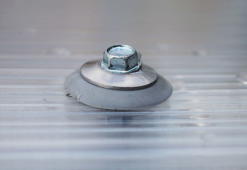 Нержавеющая сталь, которая применяется при изготовлении шайб, имеет очень стойкие свойства. Материал почти не поддаётся коррозии или разрушению под воздействием перепадов температуры, сухости или влажности. По форме такая шайба напоминает мелкую тарелку. В глубине находится уплотнительная прокладка из вспененного полиуретана, которая позволяет плотно и надежно прилегать к листу материала. Она гарантированно защитит отверстие крепления от попадания пыли, грязи и влаги внутрь. Такого уплотнителя должно хватить минимум на 40 лет. Этот вид крепления незаменим в районах с сильными ветровыми нагрузками и при креплении больших площадей материала. При использовании с алюминиевым или металлическим профилем получается надежная и крепкая конструкция, которой не страшны жёсткие погодные условия. Хорошо подходит для крепления поликарбоната на кровлю, покрытия для бассейна или теплицы, навеса для автомобиля.