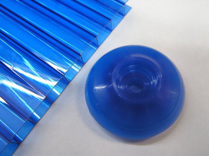 Термошайбы производятся в той же цветовой гамме, что и панели из сотового поликарбоната, а также имеют размер идентичный толщине выпускаемых панелей. Термошайба покрыта защитным УФ-слоем, который продлевает срок службы. При монтаже поликарбоната термошайбы играют основную или вспомогательную роль крепежа. Как для литого, так и для сотового полимера шайбы следует подбирать определенных, соответствующих толщине полотна размеров, чтоб «ножка» шайбы в точности совпадала с толщиной торца плиты поликарбоната. В отверстие вставляется саморез, которым термошайба притягивается к каркасу теплицы. При этом ножка термошайбы упрется в каркас теплицы и не даст саморезу повредить лист поликарбоната. При изменениях температуры поликарбонат свободно будет перемещаться в зазорах между отверстиями. После монтажа все термошайбы герметизируются колпачками. Под термошайбы отверстия необходимо сверлить не меньше чем за 4 см от края листа.