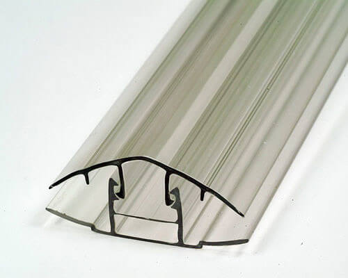 Как понятно из названия, это крепление поликарбоната к каркасу с помощью специального профиля. Стыковочный или соединительный профиль представляет собой длинную пластиковую или металлическую планку, внутри имеющую определенное строение (чаще всего Н-образное). Предназначается для стыковки или соединения двух листов сотового поликарбоната на теплицах, кровлях, перегородках, фасадах.