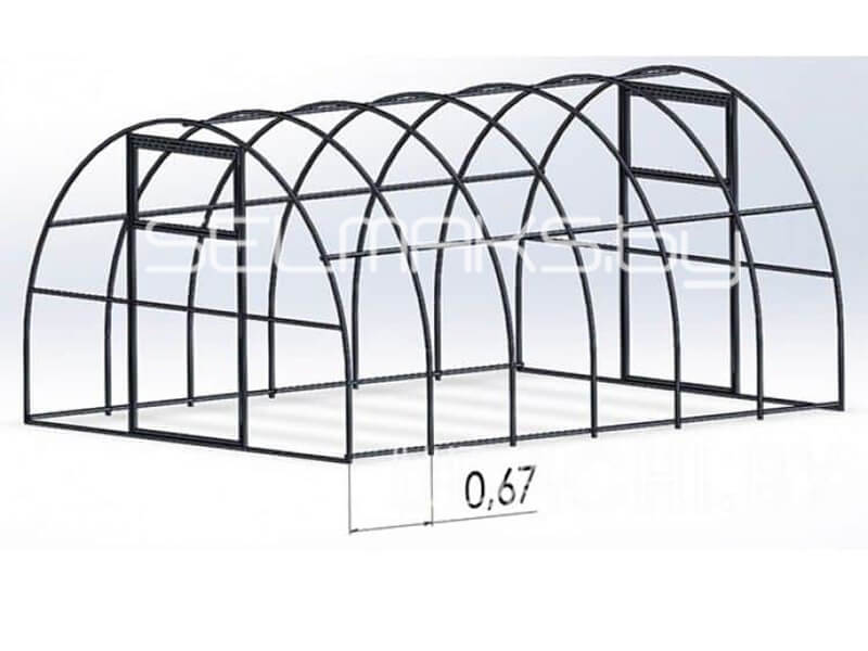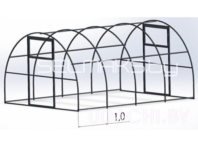 Немаловажным аспектом при выборе теплицы является расстояние между дугами. Мы производим теплицы с шагом дуги 67 см и 1 м. Чем меньше шаг дуги, тем прочнее будет изделие, так оно будет успешно противостоять не только завалам снега, но и сильным, нередко ураганным ветрам. Для теплиц с расстоянием между дугами 1 м предусмотрены усилители дуг.