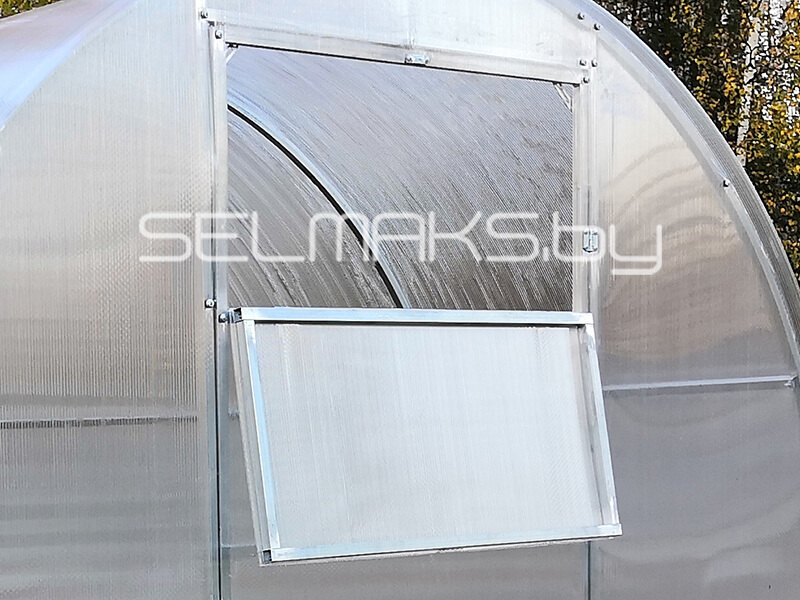В комплекте идут две двери и две форточки, которые обеспечивают правильный режим проветривания, создающий благоприятный микроклимат для получения богатого урожая в теплице.