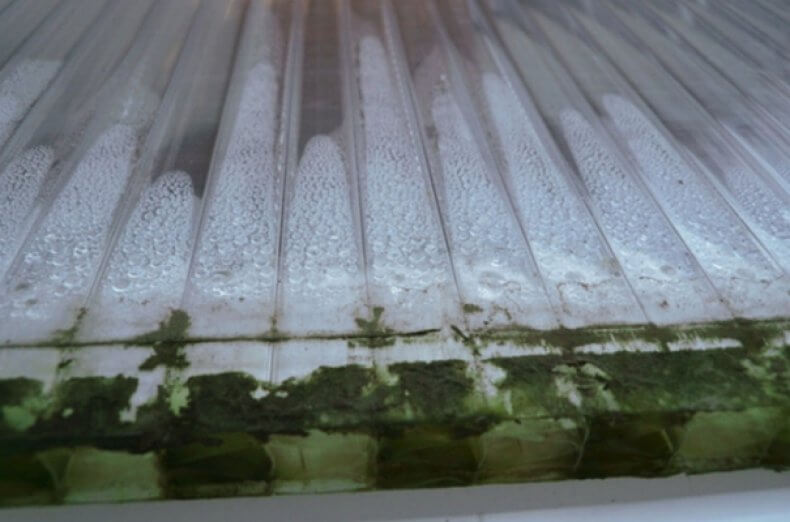 Обычное состояние листа без термического расширения достигается при температуре от 10-25 С. Поэтому рекомендовано устанавливать листы поликарбоната именно при такой температуре (особенно цветные листы). При монтаже летом в жару панели нужно устанавливать вплотную, в том числе к замку стыковочного профиля. Снижение температуры уменьшит размер листа поликарбоната и появится нужный зазор между замком профиля и листом, что обеспечит дополнительный отход влаги.