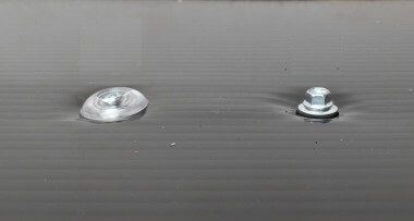 Нержавеющая сталь, которая применяется при изготовлении шайб, имеет очень стойкие свойства. Материал почти не поддаётся коррозии или разрушению под воздействием перепадов температуры, сухости или влажности. По форме такая шайба напоминает мелкую тарелку. В глубине находится уплотнительная прокладка из вспененного полиуретана, которая позволяет плотно и надежно прилегать к листу материала. Она гарантированно защитит отверстие крепления от попадания пыли, грязи и влаги внутрь. Такого уплотнителя должно хватить минимум на 40 лет. Этот вид крепления незаменим в районах с сильными ветровыми нагрузками и при креплении больших площадей материала. При использовании с алюминиевым или металлическим профилем получается надежная и крепкая конструкция, которой не страшны жёсткие погодные условия. Хорошо подходит для крепления поликарбоната на кровлю, покрытия для бассейна или теплицы, навеса для автомобиля.